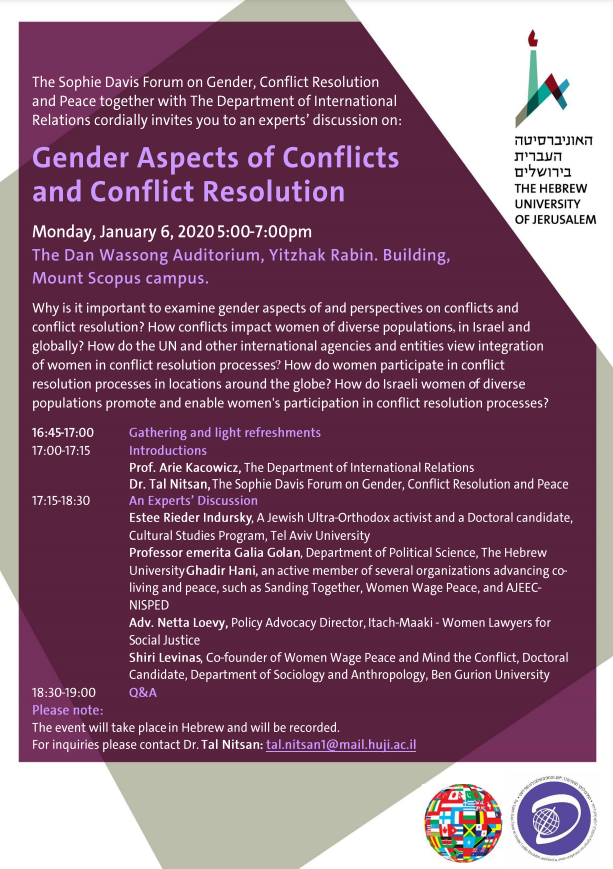 Why is it important to examine gender aspects of and perspectives on conflicts and conflict resolution? How conflicts impact women of diverse populations, in Israel and globally? How do the UN and other international agencies and entities view integration of women in conflict resolution processes? How do women participate in conflict resolution processes in locations around the globe? How do Israeli women of diverse populations promote and enable women's participation in conflict resolution processes?